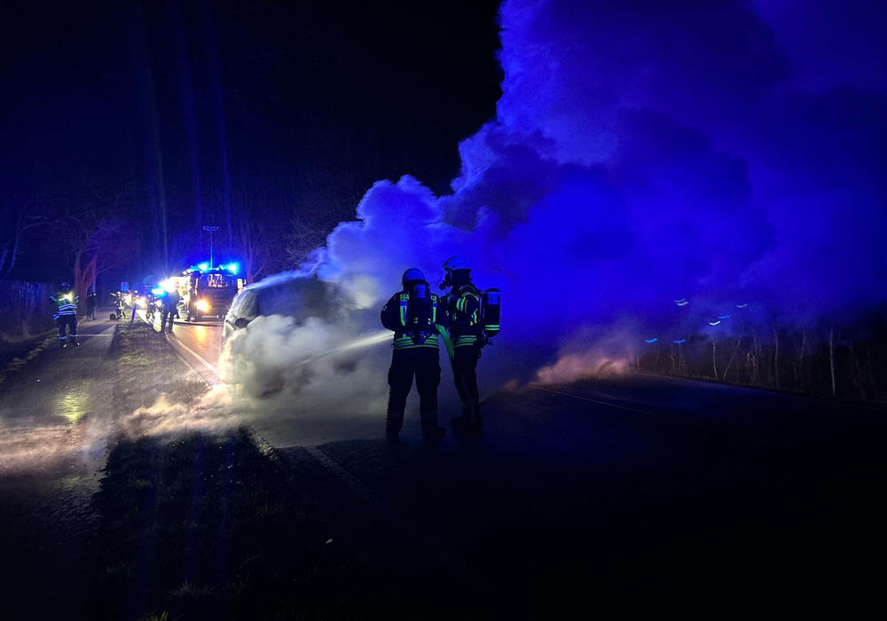 Beim Eintreffen der ersten Kräfte stand das Fahrzeug bereits in Vollbrand, wie der stellvertretende Ortsbrandmeister Lennart Pietsch berichtete. Umgehend gingen Trupps unter Atemschutz zur Brandbekämpfung vor.