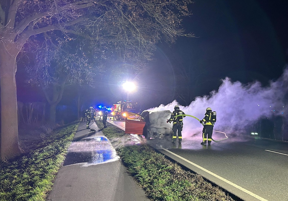 Schwülper. Am gestrigen Mittwochabend wurde die Feuerwehr Groß Schwülper um 21:05 Uhr zu einem brennenden Auto auf die Bundesstraße 214 zwischen Harvesse und Ersehof alarmiert. Bereits auf der Anfahrt wurde die Feuerwehr Neubrück aus dem Landkreis Peine hinzugezogen. Insgesamt waren 23 Einsatzkräfte der Feuerwehr sowie die Polizei mit zwei Streifenwagen im Einsatz. Das berichtet die Kreisfeuerwehr Gifhorn in einer Pressemitteilung.