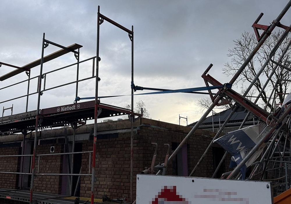 Die Einsatzkräfte sicherten das Gerüst mit Spanngurten, um ein weiteres Umkippen zu verhindern, und sperrten die Baustelle weiträumig mit Absperrband ab. Nach etwa einer halben Stunde war die Gefahrensituation beseitigt. Die Drehleiter musste nicht mehr eingesetzt werden, teilte die Freiwillige Feuerwehr Aurich mit.