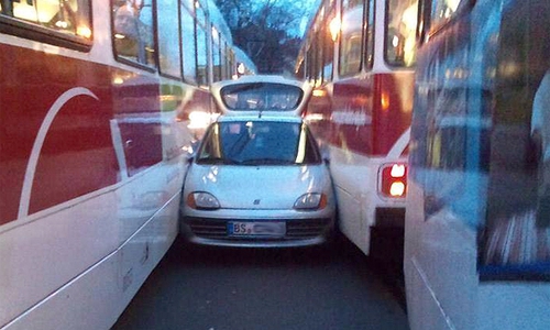 Kurioser Unfall: Straßenbahnen nehmen Fiat in die Zange