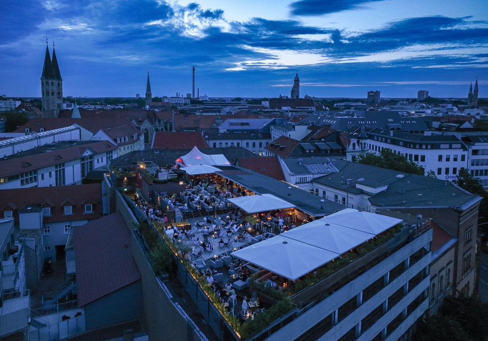 „Wir nehmen übrigens auch Happenings in kleinem Rahmen zwischen zehn und 40 Personen an“, bestärkt Hegele. „Für größere Feiern bis zu 200 Personen besitzen wir einen eigenen, abgetrennten und wettergeschützten Veranstaltungsbereich und verfügen mit der Etage Eins über eine Ausweichlocation, wenn das Wetter wider Erwarten richtig schlecht sein sollte.“ So könne die jeweilige Veranstaltung in jedem Fall stattfinden: bei gutem Wetter unter freiem Himmel mit Blick über die Stadt und bei Sturm und Regen in der Veranstaltungslocation Etage Eins im selben Gebäude.