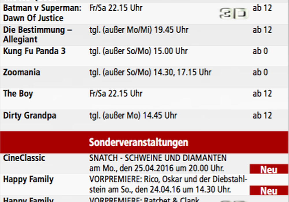 CineStar-Filmprogramm vom 21. bis 27. April CineStar-Filmprogramm vom 21. bis 27. April. Foto: Privat 18.04.2016, 20:18 Uhr Weitere spannende Artikel Schäfer's Bäckerei zieht aus REWE-Märkten aus: So geht es jetzt weiter Weihnachtsbaum fehlt: Schlossplatz ohne festliches FlairEinsatzreicher 3. Advent: Unfälle und Brand halten Feuerwehr in Atem