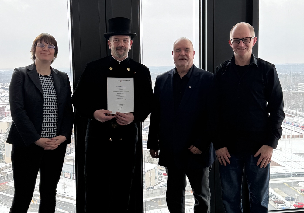 In einer kleinen Feierstunde gratulierten Umweltdezernentin Anna Katharina Hanusch, der Ehrenobermeister der Schornsteinfegerinnung Braunschweig, Frank Dornemann, sowie der Stellenleiter für den Bereich Schornsteinfegerwesen im städtischen Fachbereich Umwelt, Thomas Schulze, Markus Steuer zur Bestellung.