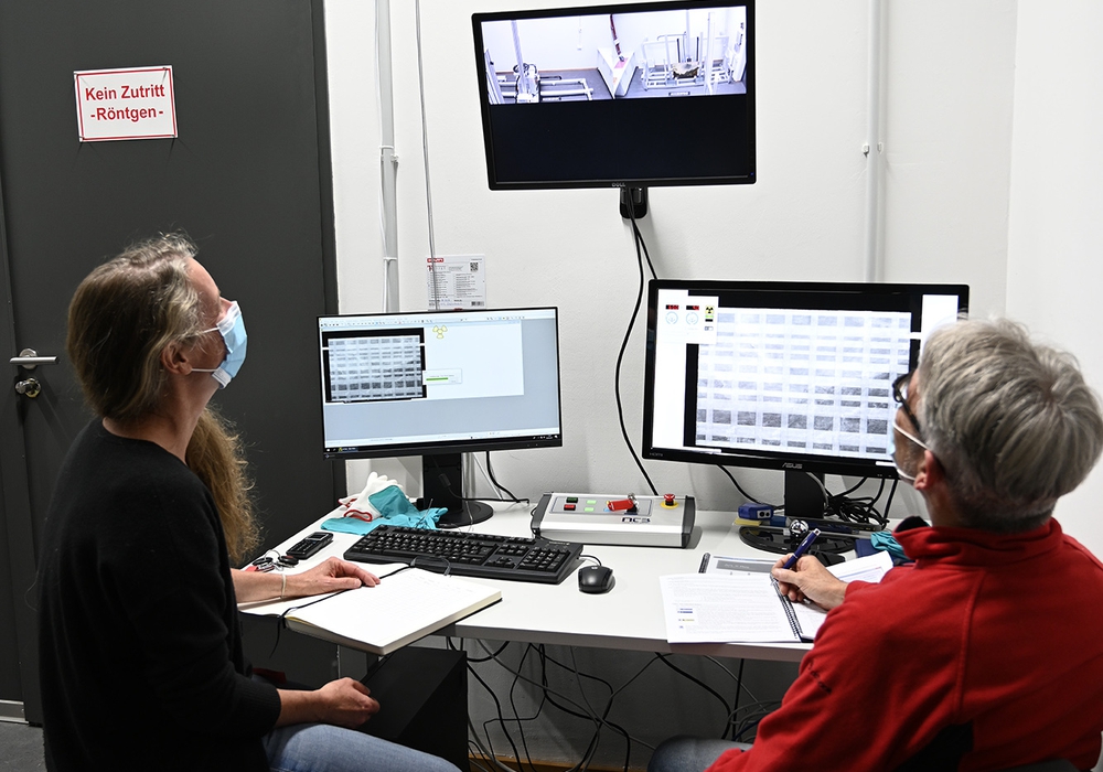 Kamera-überwachung des Röntgenprozesses mit 3D-Monitor (rechts im Bild). Foto: Herzog Anton Ulrich-Museum / Kathrin Ulrich