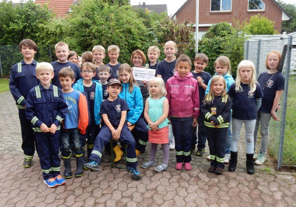 Das Betreuerteam, bestehend aus Kinderfeuerwehrwartin Ina Barluschke, ihrer Stell-vertreterin Stefanie Gölling und den Betreuerinnen Verena Kadereit, Sonja Borchardt Marvin Renneberg und Lena-Marie Barluschke hatte eine große Hüpfburg aufgebaut. In der großen Fahrzeughalle gab es ein großes und buntes Buffet zudem auch die Eltern mit viel Aufwand beigetragen hatten. Bratwurst und Getränke durften natürlich auch nicht fehlen. Neben den Gruß- und Dankesworten der Verantwortlichen aus Kinder- und Ortsfeuerwehr an Kinder und Eltern für ein tolles Jahr mit vielen Aktivitäten konnte sie auch auf die weiterhin guten Mitgliederzahlen hinweisen. Einen besonderen Gast konnte ebenfalls noch begrüßt werden. Von der Öffentlichen Versicherung Braunschweig war Frau Anja Wendhausen gekommen. Sie hatte einen großen Scheck über 300 Euro dabei. Seit Sept. 2015 unterstützt die Öffentliche Versicherung Braunschweig die Kinderfeuerwehren in ihrem Verbreitungsgebiet mit einer jährlichen Zuwendung. Frau Wendhausen betonte bei der Scheckübergabe an das Team der Kinderfeuerwehr, dass man schon sehr früh junge Leute an das Ehrenamt heranführen muss. Hier leisten Kinderfeuerwehren eine großartige Arbeit und dieses hat die Unterstützung besonders verdient. Als besonderes Geschenk bekamen die Kinder die anliegenden Bälle geschenkt Die versammelten Eltern überraschten das Team der Löschlöwen mit einem großzügigen Geschenkgutschein für die geleistete Arbeit. Auch das Maskottchen Leo freut sich über zahlreiche kleine und große Spenden. Danach hieß es „Toben und spielen“ und ran ans Buffet. Ein toller Nachmittag verging wie im Fluge und alle freuen sich schon auf den Start nach den Sommerferien.