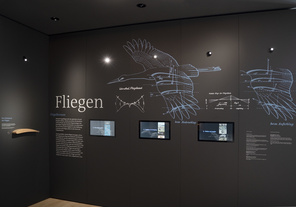Neun Präparate – vom Rotmilan über den Graureiher bis hin zum Albatros mit der gewaltigen Spannweite von drei Metern – schweben über den Köpfen der kleinen und großen Besucher und informieren über verschiedene Flügel- und Flugformen. Sieben Medieneinheiten laden dazu ein, sich interaktiv mit Themen wie Federn, Eiern, Vogelzug und Vogelstimmen zu befassen, und natürlich mit der Frage aller Fragen: Wieso können Vögel eigentlich fliegen?