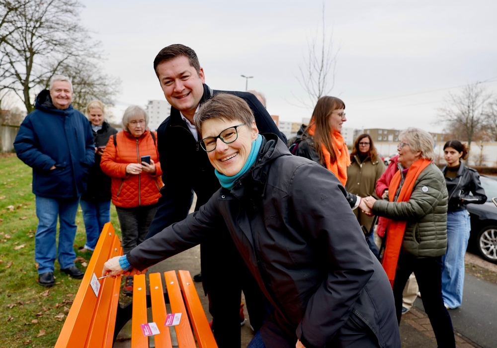Oberbürgermeister Dr. Thorsten Kornblum hat mit der Gleichstellungsbeauftragten Marion Lenz zum Abschluss des Aktionszeitraums gegen Gewalt an Frauen eine orangene Bank in der Elbestraße, Weststadt, offiziell der Öffentlichkeit vorgestellt. In Anwesenheit von Bezirksratsmitgliedern und Aktiven gegen Gewalt an Frauen haben sie das Hinweisschild gemeinsam angeschraubt und über die Aktion informiert.