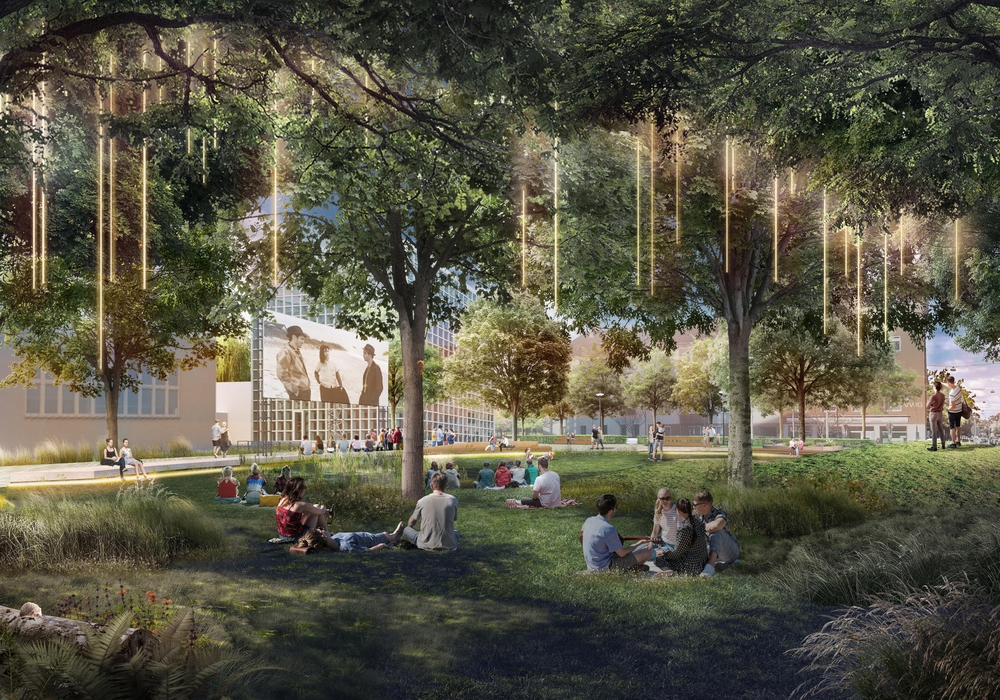 Der neue Johannes-Selenka-Platz soll aus zwei Hauptelementen bestehen: einer offenen Platzfläche, die einen klaren Rahmen bietet und als großzügiges Entrée zum Haupteingang der HBK dient, und dem kreisförmigen, grünen "Paradies", einer lebendigen Gartenlandschaft, die eine eigenständige Atmosphäre schafft und vielfältige Nutzungsmöglichkeiten bietet. Das "Paradies", mit einer Grünfläche von etwa 380 Quadratmetern wird zum ausdrucksstarken Zentrum und bietet Raum zum Sitzen, Liegen und Spielen. Darüber hinaus kann es auch als Ausstellungsort für künstlerische Aktivitäten oder für Freiluftkino genutzt werden. Offene Grünflächen tragen zur Kühlung im Sommer bei und fördern die Stadtökologie. Ein neuer Trinkbrunnen am Radweg zum Ringgleis ist geplant.