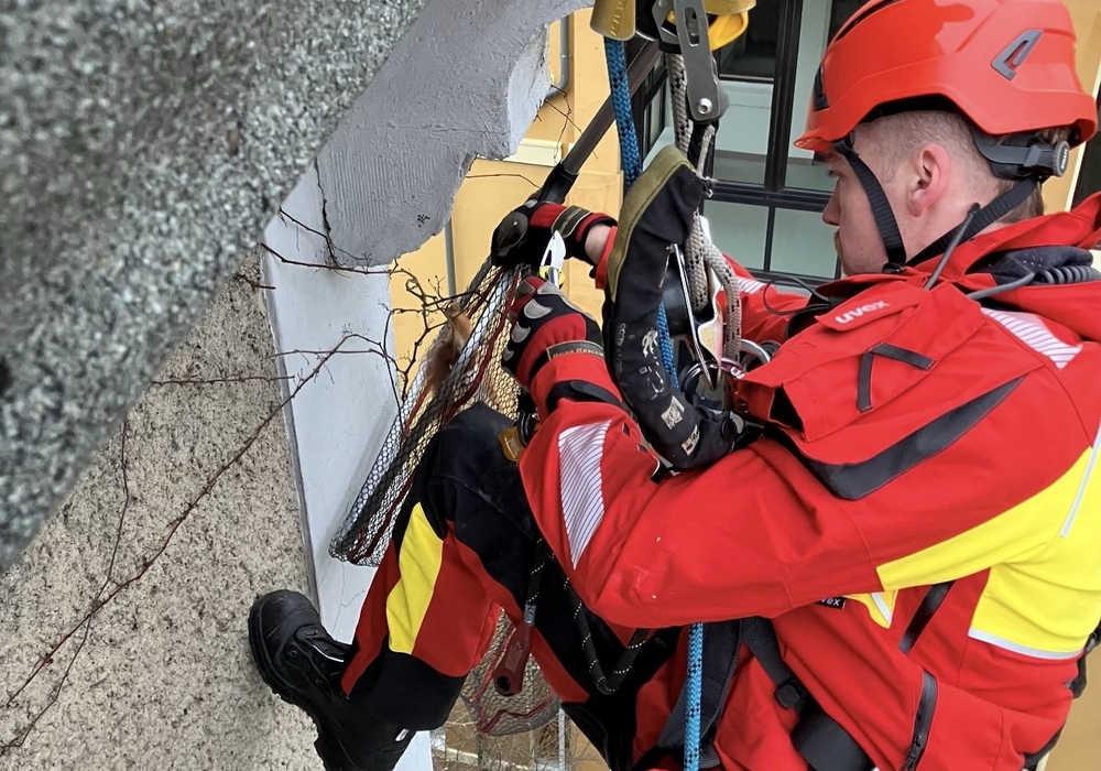 Die speziell ausgebildeten Einsatzkräfte verschafften sich über das Dach des Gebäudes Zugang zur Einsatzstelle und seilten sich anschließend kontrolliert zur Position des Tieres ab. In der Folge konnte das Eichhörnchen vorsichtig aus der Kletterpflanze befreit werden.