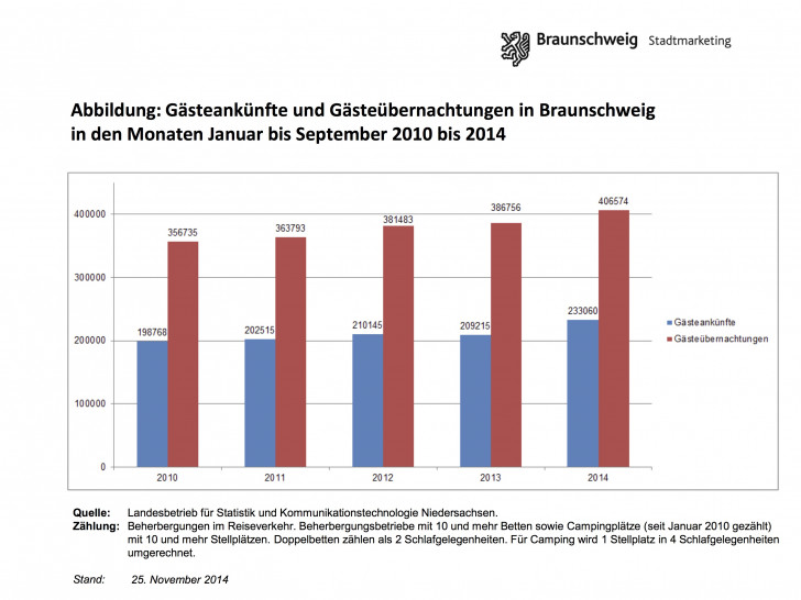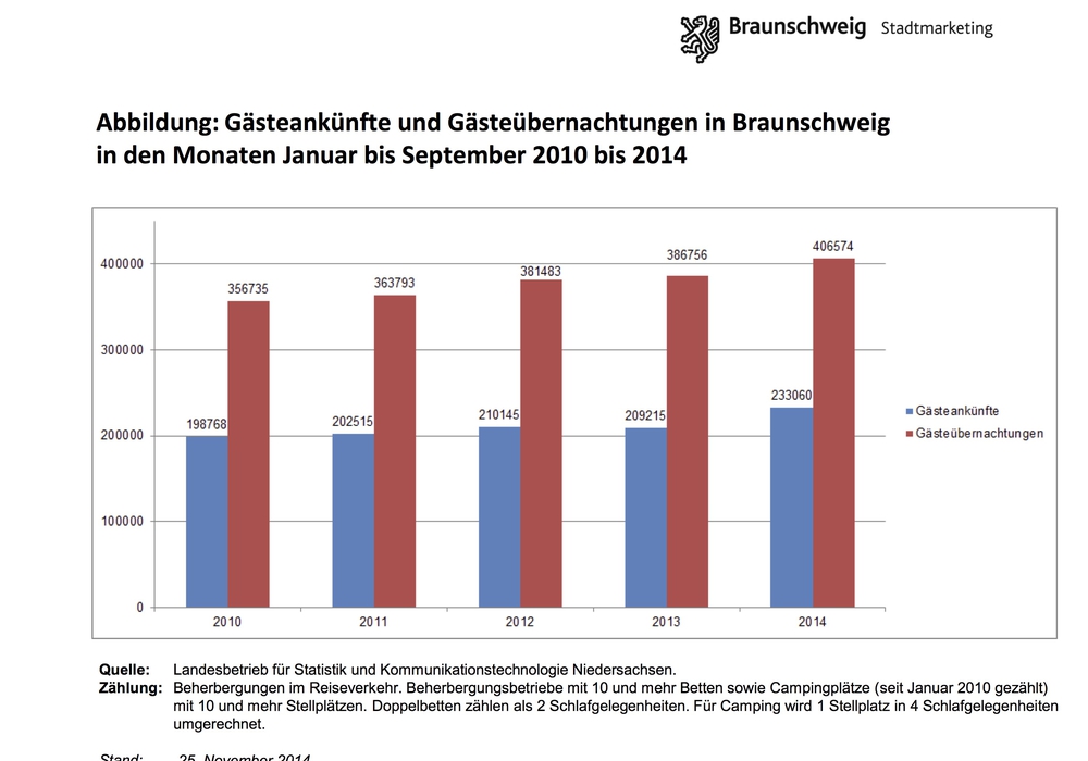 Verglichen mit den ersten neun Monaten des Vorjahres liegen die Zahlen in diesem Jahr bereits deutlich darüber. 2013 gab es bis einschließlich September rund 209.000 Ankünfte und etwa 387.000 Übernachtungen. 2014 sind es bereits rund 233.000 Ankünfte und circa 407.000 Übernachtungen. Das entspricht einer prozentualen Steigerung von 11,5 Prozent (Ankünfte) beziehungsweise 5,2 Prozent (Übernachtungen). Wieslaw Puzia, Vorsitzender des Arbeitsausschusses Tourismus Braunschweig e. V., ergänzt: "Wir konnten bis einschließlich September bereits über 400.000 Übernachtungen verzeichnen. Unser vorab genanntes Wunschziel von einer halben Million Übernachtungen werden wir also bestimmt erreichen." In den letzten fünf Jahren lag die Zahl der Übernachtungen pro Quartal nie unter 110.000, im viertel Quartal sogar nie unter 120.000.