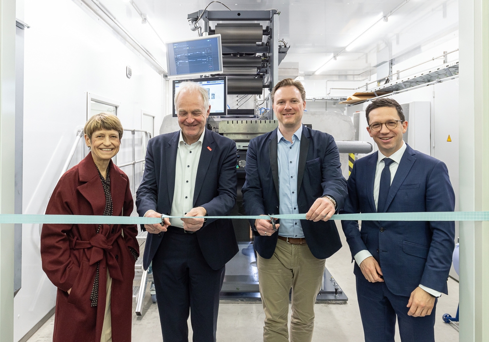 Bei der Einweihung der Batterieforschungsanlage ForBatt an der TU Braunschweig am 6. März 2026: TU-Präsidentin Prof. Angela Ittel, Prof. Arno Kwade, BMFTR-Referent Dr. Stefan Jung und Niedersachsens Wissenschaftsminister Falko Mohrs (v.l.). Foto: Christian Bierwagen / TU Braunschweig
