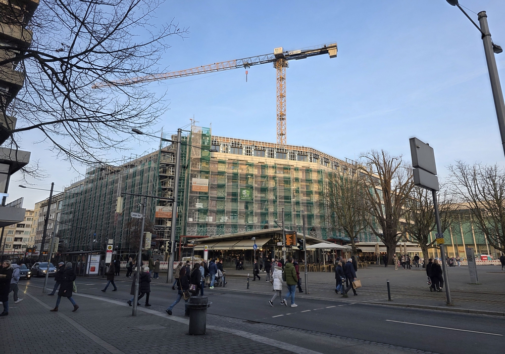 Das teilt unter anderem die Volksbank BraWo mit, die dort die Bauarbeiten am Schlosscarree durchführen lässt. Diese laufen auf Hochtouren, heißt es in einer Pressemitteilung der Volksbank. Nun werde dort ein Schwerlastkran abgebaut.