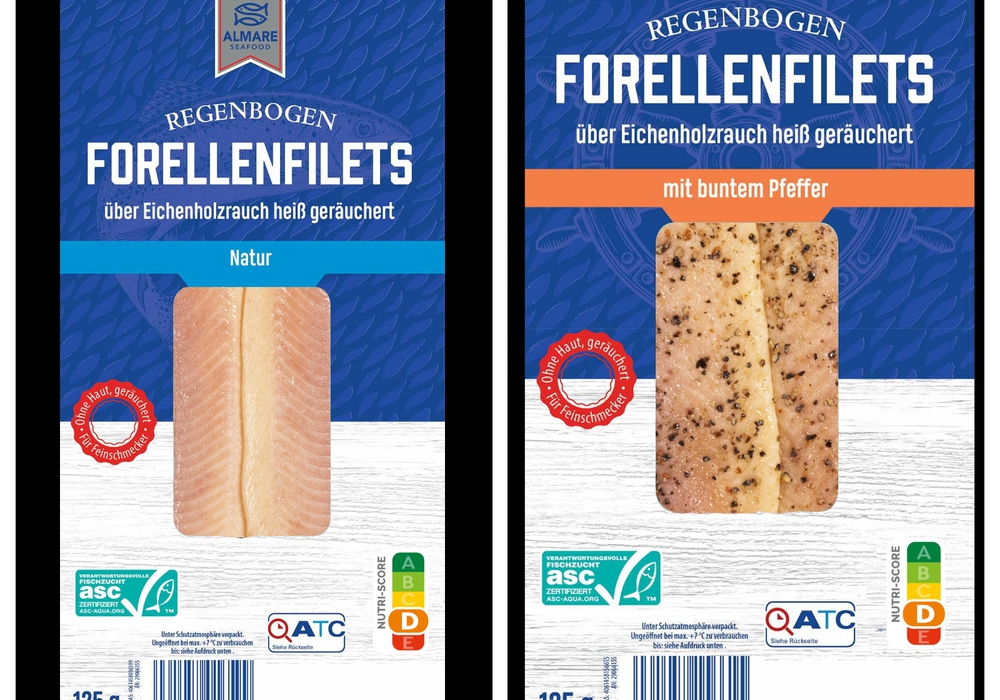 • Almare Seafood Regenbogenforellenfilets 125g, Natur (EAN 4061458016599) & Pfeffer (EAN 4061458156615) verkauft durch ALDI SÜD Deutschland.