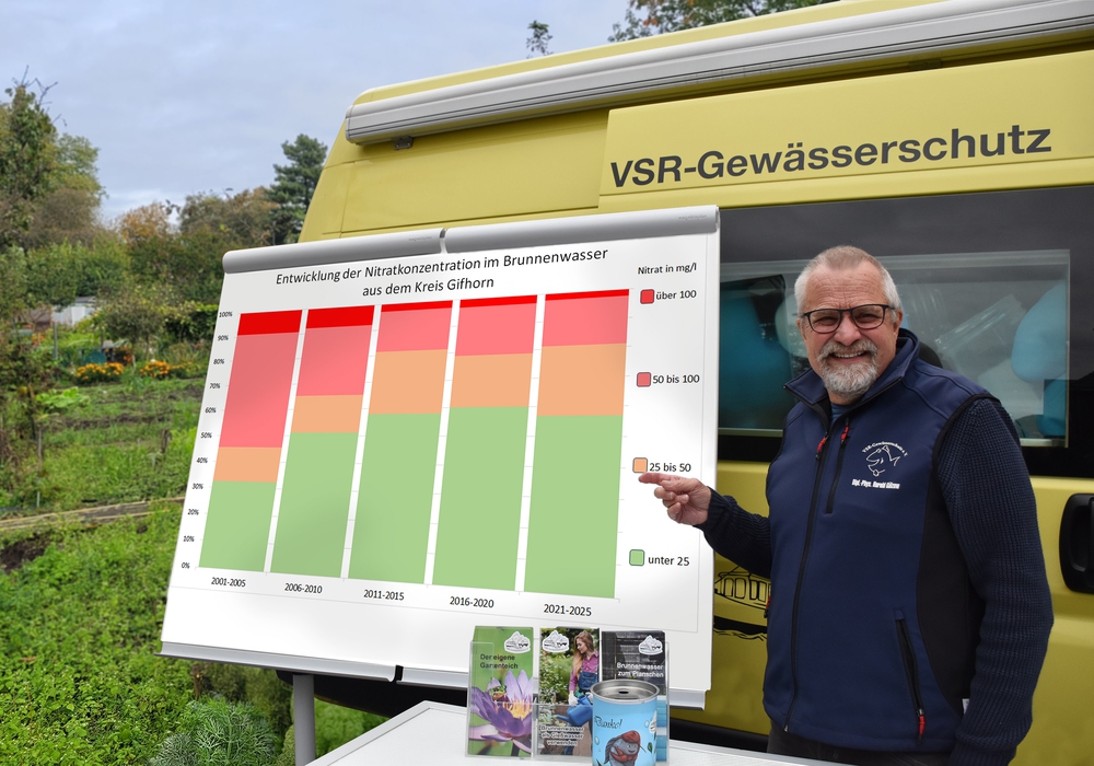 Der VSR-Gewässerschutz findet seit Beginn der Untersuchungen in vielen Gartenbrunnen Nitratwerte über 50 mg/l. Die Nitratrichtlinie verpflichtet allerdings bereits seit 1991 dazu, diese Überschreitungen im Grundwasser zu verhindern. „Während in den Jahren 2001 bis 2005 noch 54,6 Prozent der Brunnen den Grenzwert überschritten, waren es im Zeitraum 2021 bis 2025 immer noch 18,9 Prozent. Besonders problematisch ist, dass der Anteil der Brunnen mit einer Nitratbelastung von über 100 mg/l im gesamten Zeitraum nur auf 2,4 Prozent sank“, erläutert Harald Gülzow, der die Nitratuntersuchungen im Kreis Gifhorn von Anfang an begleitete. "Es zeigt sich, dass die Maßnahmen in der Landwirtschaft zur Verringerung der Nitratbelastung im Grundwasser Wirkung zeigen. Allerdings ist die Nitratbelastung bisher nicht wie gehofft gesunken“, ist sein Fazit. Er erklärt, dass der VSR-Gewässerschutz auch dieses Jahr wieder mit dem Labormobil in den Kreis Gifhorn kommen wird, um die Entwicklung der Nitratbelastung weiter zu beobachten. Die Termine, an denen das Labormobil in der Region hält, werden auf der Homepage veröffentlicht. Zusätzlich findet man dort weitere Ergebnisse und die dazugehörigen Grafiken.