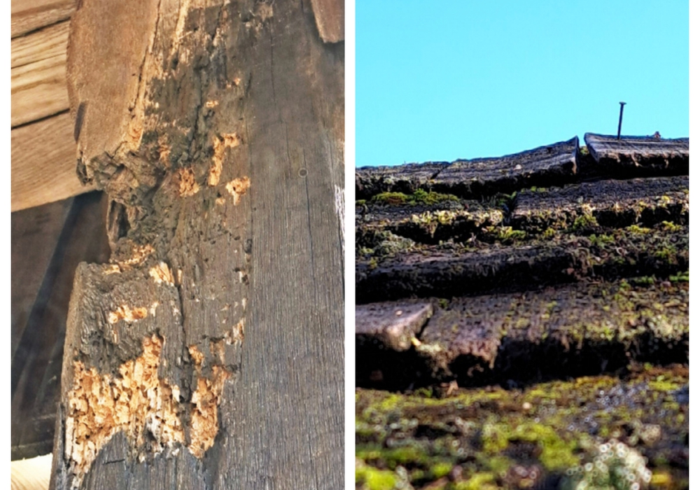 Zwei Beispiele der dokumetierten Schäden: Holzwurmschäden an tragenden Bauteilen der Bockwindmühle Viktoria (li.) und die desolate Dacheindeckung und abstehende Nägel am Tor des Nebeneingangs. Foto: Stadt Gifhorn