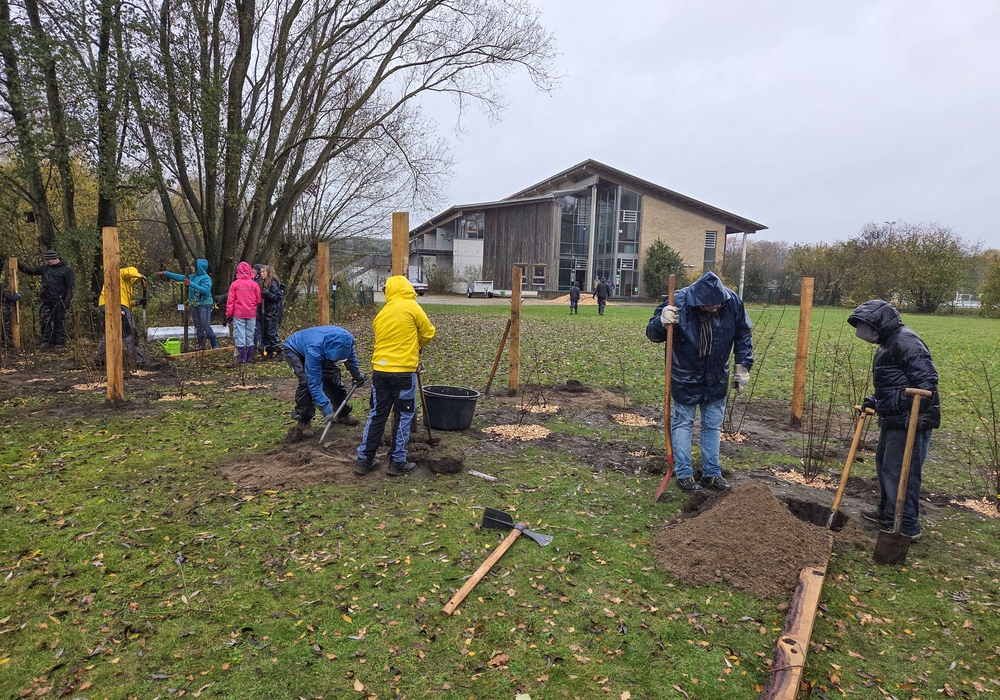 Im Laufe des Vormittags pflanzten die Schüler und Eltern 70 heimische Heckenpflanzen, drei Obstbäume und errichteten rund 100 Meter Wildschutzzaun. Ein gemeinsames Frühstück rundete den Morgen ab. „Es ist beeindruckend zu sehen, wie motiviert unsere Schüler bei Wind und Wetter gemeinsam für den Naturschutz arbeiten. Das Minidrachenland wird nicht nur ein wertvoller Lebensraum für heimische Arten, sondern auch ein Lernort, an dem junge Menschen ökologische Zusammenhänge ganz praktisch erfahren können“, erklärt Florian Preusse, Diplom-Biologe und Lehrer am Sibylla-Merian-Gymnasium, der die naturkundlichen Arbeitsgemeinschaften leitet.