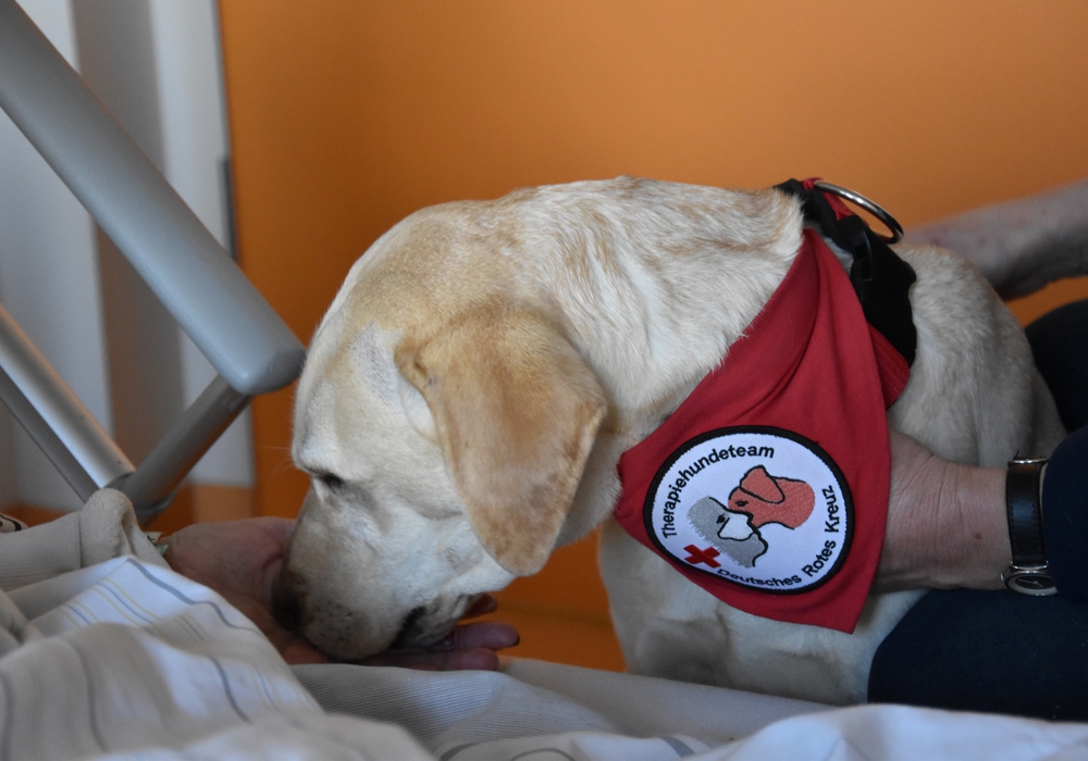 Alba ist Mitglied im Therapiehundeteam des DRK Wolfsburg. Um zertifizierter Therapiehund zu werden, haben Gundula Witte und ihr Hund eine 120-stündige Ausbildung in Theorie und Praxis absolviert, die sie im Mai 2025 erfolgreich abgeschlossen haben. Auf der Station trägt Alba ihr typisches „Arbeitsoutfit“ – rotes Halstuch, passendes Halsband – und ist dann ganz in ihrem Element. „Die Grundintention unseres Besuches ist, ein bisschen Freude zu bringen“, sagt Gundula Witte. Dabei achtet sie besonders auf die individuellen Bedürfnisse der Patientinnen und Patienten. Mal sitzt die Hündin auf einem Hocker neben dem Bett und lässt sich streicheln, mal zeigt sie kleine Kunststücke – zieht Socken aus oder nimmt Wäsche von einer Leine. Die Wäscheleine hat Gundula Witte immer im Rucksack – und Leckerlis natürlich auch. „Viele sagen: 'Ich habe eine Katze zuhause, aber es ist auch schön, mal wieder einen Hund zu streicheln.' So entstehen ganz locker kleine Gespräche, die guttun“, erzählt Witte, die ehrenamtlich im Einsatz ist.