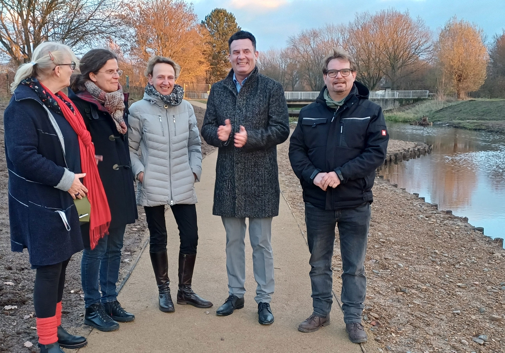 Von links: Maike Klesen (Fachbereichsleitung Stadtentwicklung), Ellen Schulze (ökologische Baubegleitung) Astrid Behrens (Fachbereichsleiterin Tiefbau), Bürgermeister Matthias Nerlich) und Karsten Hahn (Projektleiter). Foto: Stadt Gifhorn