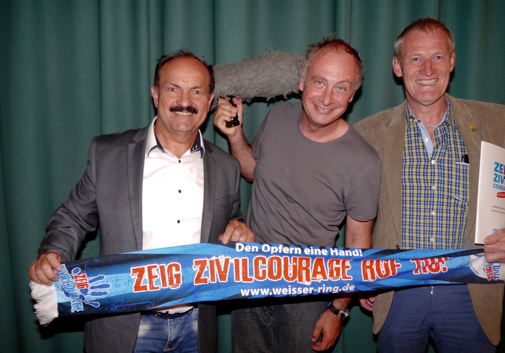 Martin Schilff und Günter Koschig, Impulsgeber der Goslarer Zivilcouragen- Kampagne, trafen kürzlich in Seesen auf den Kabarettisten "Alfons" und konnten ihn für ihr Projekt gewinnen. Foto: Weißer Ring | Foto: Weißer RRing