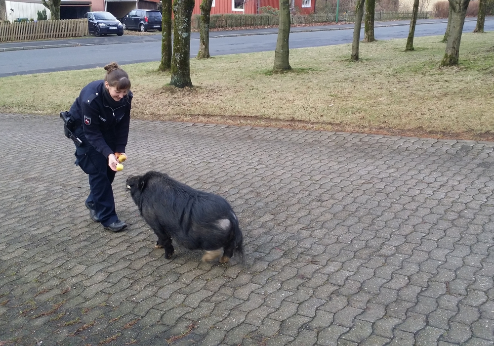 Polizeibeamtin lockt das ausgerissene Schwein mit Leckerlies nach Hause. Foto: Polizei | Foto: Polizei GS