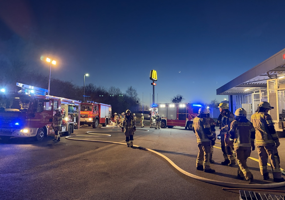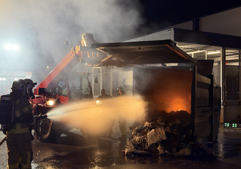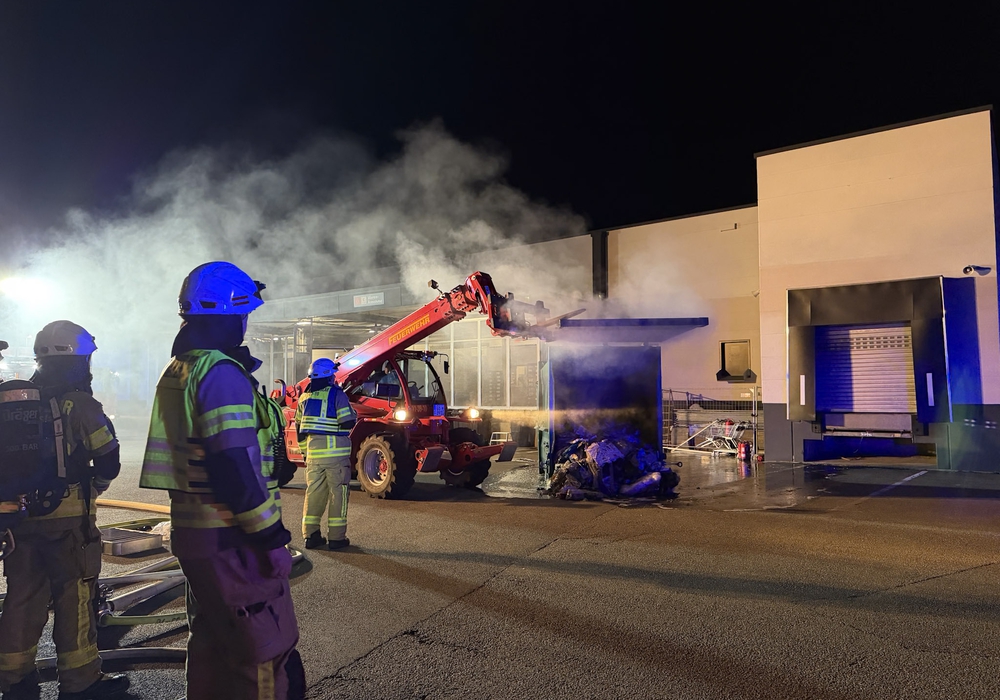 Beim Eintreffen der ersten Einsatzkräfte zeigte sich, dass der Markt durch das Personal bereits vorbildlich und innerhalb kürzester Zeit geräumt worden war. Ein Atemschutztrupp erkundete den betroffenen Bereich sowohl im Inneren des Lagerbereiches als auch im Außenbereich. Dabei wurde festgestellt, dass sich das Brandgeschehen auf die Müllpresse an der Außenwand des Lagerbereiches beschränkte.