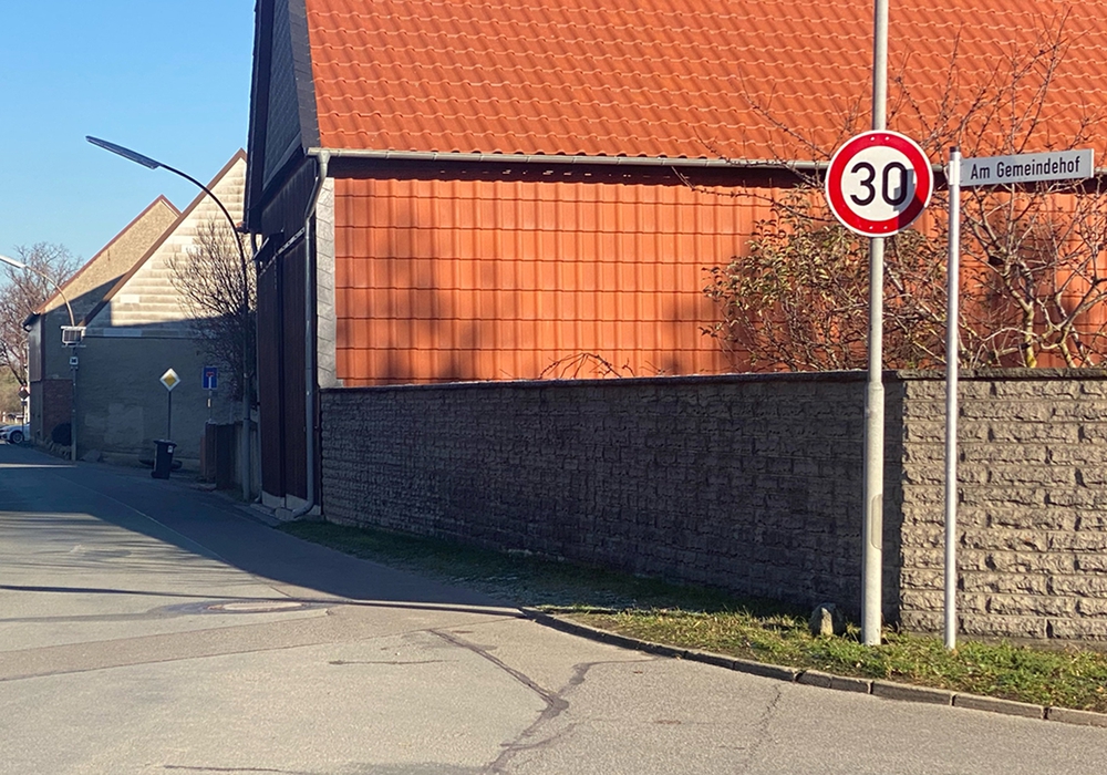In dem genannten Streckenabschnitt steht kein Gehweg zur Verfügung. Die Fahrbahn weist zwischen den Einmündungen Am Sportplatz und Am Gemeindehof lediglich eine Breite von 5,70 Metern auf, in weiteren Bereichen sogar nur rund fünf Meter. Ein durchgängiger Geh- oder Radwegbau ist aufgrund fehlenden Seitenraums nicht möglich. Der leicht kurvige Straßenverlauf sowie die nur begrenzt vorhandenen Ausweichmöglichkeiten erhöhen zusätzlich das Risiko für Fußgängerinnen und Fußgänger sowie Radfahrer.