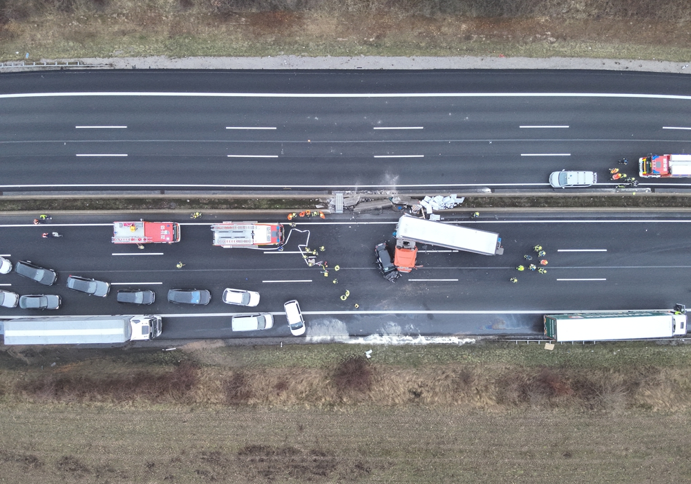 Ersten Erkenntnissen nach soll ein Autofahrer (58) die Kontrolle über seinen Mercedes auf regennasser Fahrbahn verloren haben und ins Schleudern geraten sein. Ein auf dem Hauptfahrstreifen dahinter befindlicher Fahrer (26) einer Sattelzugmaschine versuchte, dem Mercedes auszuweichen. Hierbei kam er mit seiner Sattelzugmaschine mit Auflieger in den unbefestigten Seitenraum, wodurch er ebenfalls die Kontrolle über sein Fahrzeug verlor. Er schleuderte über alle Fahrstreifen und stieß letztendlich in die Betonmittelschutzwand. Diese wurde beidseitig durch den Zusammenstoß zerstört. Eine Škoda-Fahrerin (26) konnte der vor ihr verunfallten Sattelzugmaschine zwar noch nach rechts ausweichen, doch der Fahrer (41) eines hinter ihr fahrenden Sattelzugs konnte nicht mehr rechtzeitig reagieren und fuhr auf den Škoda auf.