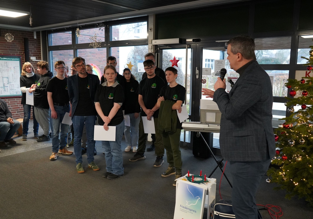 Die Schüler recherchierten im Stadtarchiv, besuchten Originalschauplätze, den jüdischen Friedhof in Goslar sowie die Synagoge in Braunschweig. Die Beschäftigung mit dem Judentum hat auch zu der Frage geführt, wie es heute als Jugendliche ist, jüdisch zu sein. Mit einem interaktiven Modell und einer Ausstellung haben die Schüler ihre Ergebnisse der Öffentlichkeit vorgestellt. Das Modell, das Informationen über das Leben jüdischer Familien in Goslar um 1933 per QR-Codes abrufbar macht, steht zurzeit im Kulturmarktplatz Goslar und wird 2026 bei den „Jüdischen Kulturtagen“ der Region zu sehen sein. Der Schülerfriedenspreis ist mit 2.500 Euro dotiert. Zusätzlich gab es noch einen Gutschein des Verlagshauses Westermann in Höhe von 500 Euro.