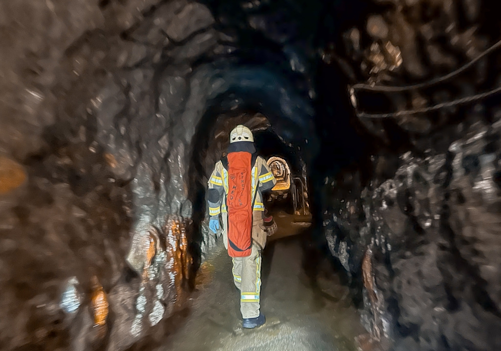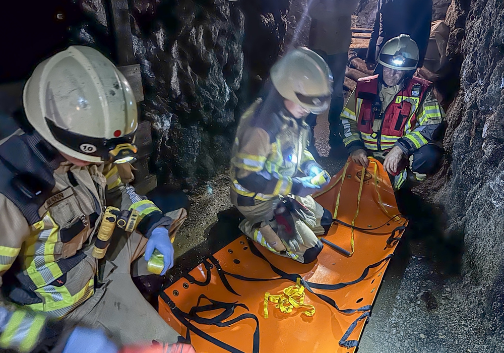 Am Zugang zum Bergwerk wurden die Einsatzkräfte bereits von Mitarbeitern in Empfang genommen und in die Situation eingewiesen, wie es in einer Pressemitteilung der Feuerwehr heißt. Nach einer kurzen Lagebesprechung fuhr die Besatzung der Feuerwehr gemeinsam mit dem Rettungsdienst in das Bergwerk ein, um die Erstversorgung und eine mögliche Rettung unter Tage vorzubereiten. Für den Transport stand die speziell für beengte und unwegsame Bereiche konzipierte Sked Rescue System-Trage bereit – mit ihr wäre ein gesicherter Abtransport über die zahlreichen Treppenstufen der Strecke möglich gewesen.