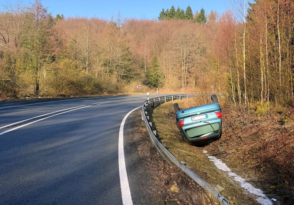 Ein 26-jähriger Autofahrer hatte aufgrund von Straßenglätte im Kurvenbereich die Kontrolle über seinen Renault verloren. Das Fahrzeug kam in der Folge von der Fahrbahn ab, stieß gegen die Leitplanke, überschlug sich und landete schließlich auf dem Dach im Seitenbereich.
