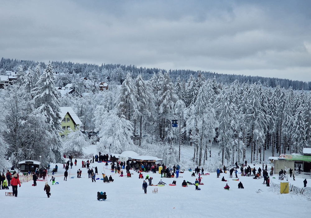 Rodelbegeisterte können sich auf Rodelspaß auf dem Böckchen mit dem Zauberteppich und auf der mit Naturschnee bedeckten, 1.500 Meter langen Winterrodelbahn freuen. Rodler und Fußgänger fahren mit der Kabinenbahn auf den Hausberg von Hahnenklee.