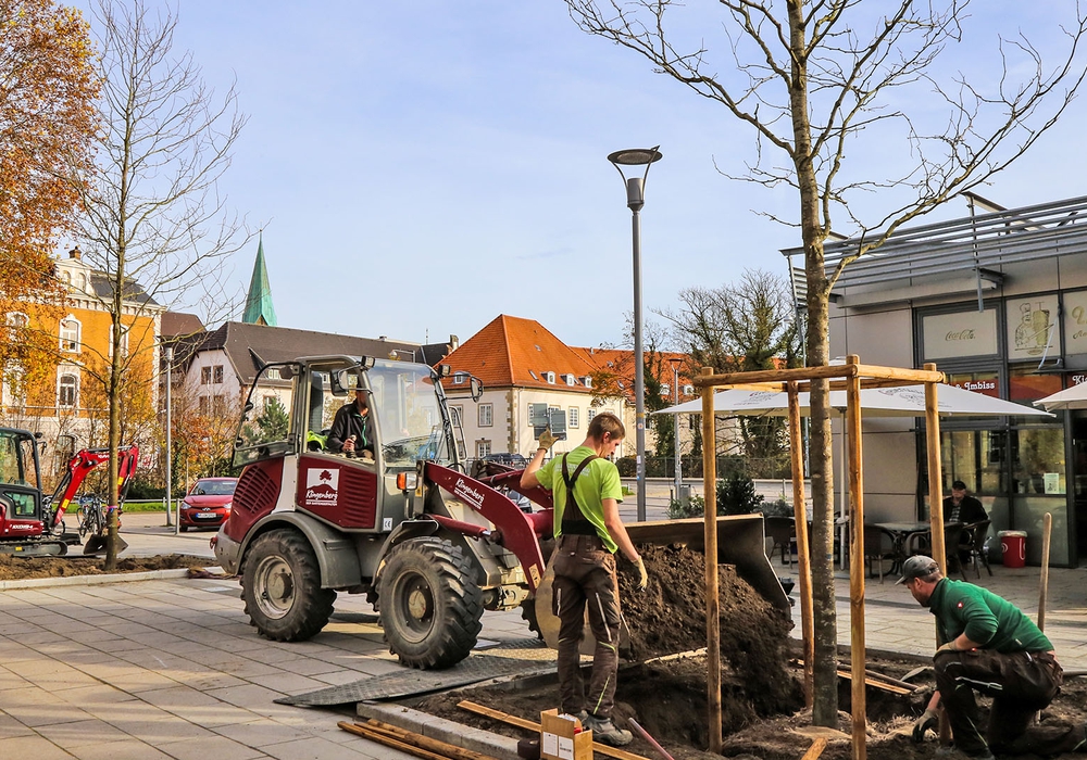 Nach der Fällung der alten Bäume wurden beide Baumscheiben von jeweils rund neun Quadratmetern auf knapp 17 Quadratmeter vergrößert. Die Flächen wurden bis zu einer Tiefe von 150 Zentimetern ausgekoffert und mit einem speziell gemischten Baumsubstrat verfüllt. Dieses besteht aus örtlichem Oberboden, steinigem Material sowie einer Beimischung von Aktivkohle zur Verbesserung der Wasserhaltefähigkeit, wie die Stadtverwaltung schreibt. Jeder neue Baum verfüge nun über einen durchwurzelbaren Raum von etwa 25 Kubikmetern – optimale Voraussetzungen für gesundes Wachstum und eine langfristige Entwicklung.
