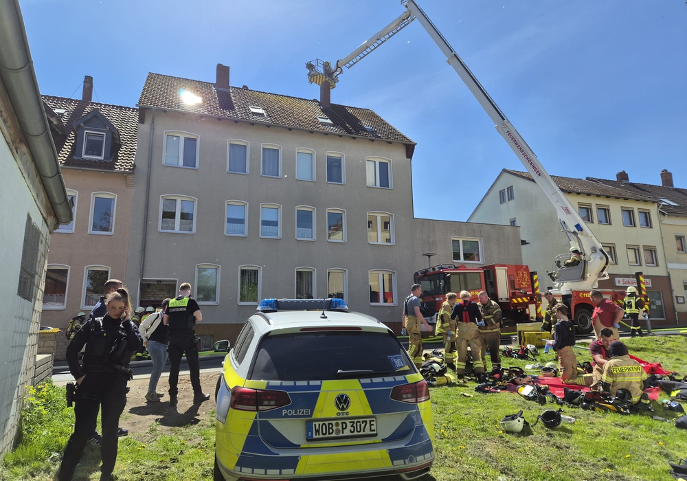 Die Erreichbarkeit der Einsatzstelle gestaltete sich aufgrund einer Baustelle auf der Helmstedter Straße erschwert, sodass die Anfahrt für die Einsatzkräfte nur unter erschwerten Bedingungen möglich war. Zur Brandbekämpfung wurde umgehend ein Teleskopmast vor dem Reihenhaus in Stellung gebracht, über den erste Löschmaßnahmen aus der Luft eingeleitet wurden. Parallel dazu gingen Einsatzkräfte vom Hof aus mit schwerem Atemschutz mit einem C-Strahlrohr zur Brandbekämpfung vor.