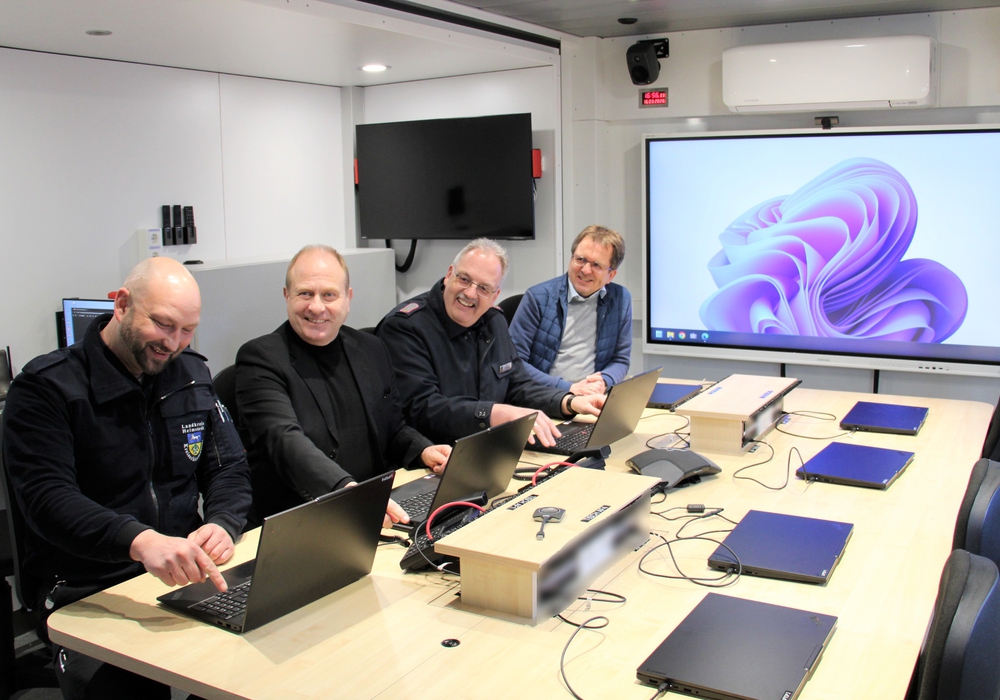 Landrat Gerhard Radeck überzeugte sich zur offiziellen Übergabe von den Qualitäten des hochmodernen ELW2: „Es ist schon beeindruckend, welche Technik heute möglich und in diesem Fahrzeug verbaut worden ist. Einerseits freut man sich über diese Möglichkeiten, aber andererseits hoffen wir alle eigentlich, dass wir keine Schadenslagen erleben müssen, in denen wir dieses Fahrzeug dann wirklich brauchen.“
