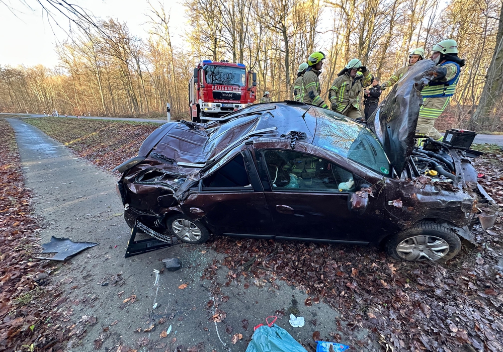 Gegen 10:05 Uhr war den Einsatzkräften ein Verkehrsunfall mit einer eingeklemmten Person am Ortsausgang von Helmstedt Richtung Helmstedt gemeldet worden. Vor Ort stellte sich heraus, dass ein Auto alleinbeteiligt von der Fahrbahn abgekommen war, sich überschlagen hatte und schließlich mit einem Baum kollidiert war. Nach dem Zusammenstoß kam das Auto auf der Seite zum Liegen. Eine Person war bei Eintreffen der Feuerwehr bereits in Behandlung durch den Rettungsdienst.