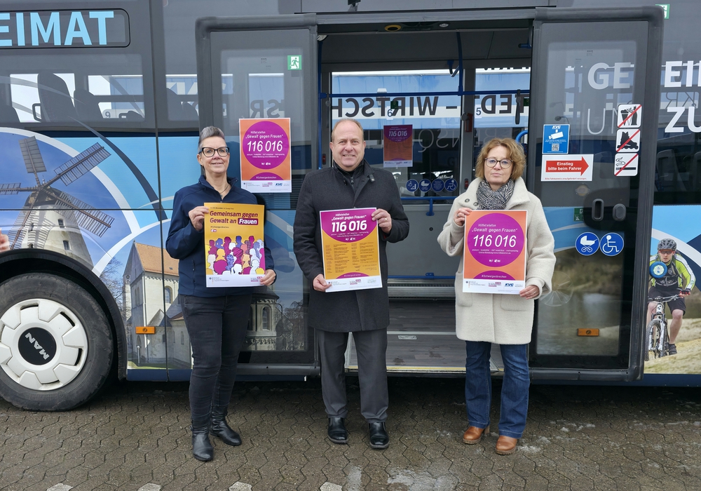 Helmstedt. Gewalt gegen Frauen ist in Deutschland nach wie vor alltäglich: Jede dritte Frau erlebt im Laufe ihres Lebens körperliche, psychische oder sexuelle Gewalt – zu Hause, in der Öffentlichkeit oder im digitalen Raum. Um das Bewusstsein dafür zu schärfen und betroffenen Frauen Hilfsangebote bekannter zu machen, starten der Landkreis Helmstedt und die KVG Braunschweig eine gemeinsame Mitmachaktion des Hilfetelefons „Gewalt gegen Frauen“.