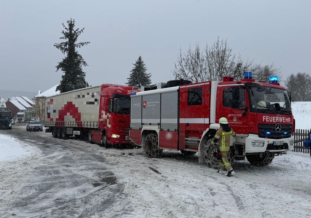Durch ein Löschfahrzeug wurden die LKW mittels Abschleppstange über die Anhöhe gezogen und konnten ihre Fahrt dann vorzusetzen.