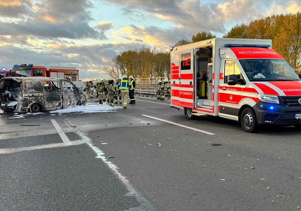 Ersten Meldungen zufolge sollten vier Autos an dem Unfall beteiligt sein. Beim Eintreffen der Einsatzkräfte bestätigte sich ein Zusammenstoß zwischen drei Autos und einem Kleintransporter. Ein Fahrzeug stand zu diesem Zeitpunkt in Vollbrand.