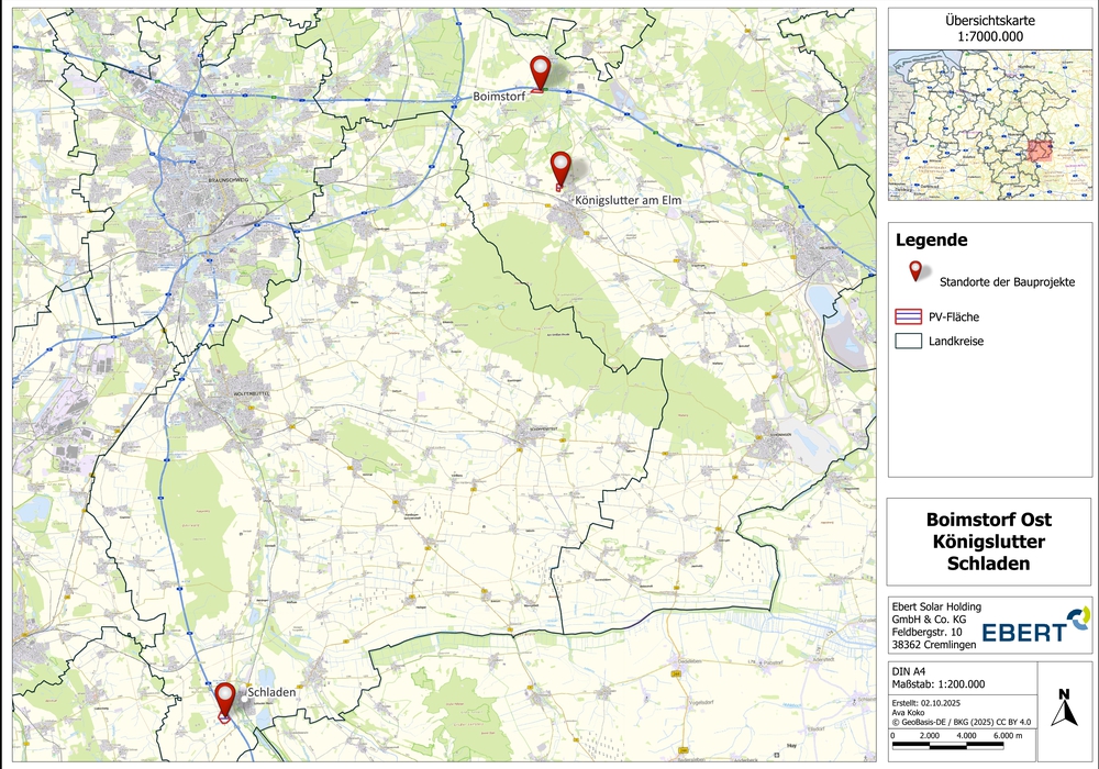 Region. Die Ebert Gruppe bündelt drei Photovoltaik-Projekte in der Region Braunschweig-Helmstedt-Wofenbüttel zu einem starken regionalen Paket: Boimstorf Ost, Königslutter am Elm und Schladen. Gemeinsam stehen sie für rund 36,5 Megawatt-Peak installierte Leistung und zirka 38 Gigawattstunden Jahreserzeugung – genug für bis zu rund 29.000 Menschen – sowie für eine jährliche CO2-Einsparung von etwa 24.420 Tonnen (über 30 Jahre rund 732.600 Tonnen). Das verspricht die Ebert Solar GmbH in einer Pressemitteilung.