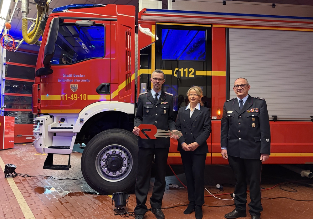 In seiner Begrüßung hob Ortsbrandmeister Kevin Schmidt die Bedeutung der Fahrzeugbeschaffung für die Feuerwehr Goslar hervor. Ein neues Einsatzfahrzeug sei weit mehr als eine technische Ergänzung des Fuhrparks. Es stehe für Sicherheit, für das Vertrauen der Stadt in die Leistungsfähigkeit ihrer Feuerwehr und für die Bereitschaft, Verantwortung für den Schutz der Bevölkerung zu übernehmen. Im Anschluss richtete Oberbürgermeisterin Urte Schwerdtner das Wort an die Gäste. Sie machte deutlich, dass der Fokus des Abends bewusst auf der Übergabe des neuen Einsatzfahrzeugs liege. Die Bestellung des HLF 20 sei bereits im Jahr 2023 erfolgt, die Auslieferung nun – nach den inzwischen üblichen langen Produktionszeiten – abgeschlossen. Umso größer sei die Freude, das Fahrzeug nun offiziell im Namen von Stadt und Rat übergeben zu können.