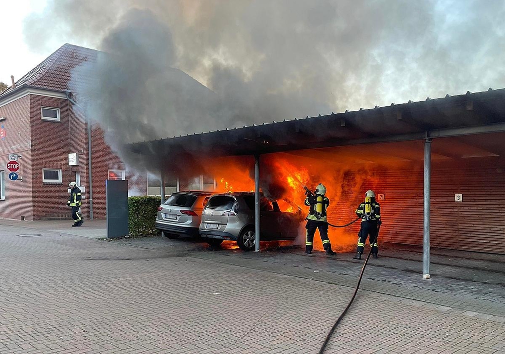 Aurich. In Aurich haben zwei unter einem Carport abgestellte Fahrzeuge am Samstagmorgen gebrannt. Die Feuerwehr teilte mit, dass das Feuer bereits auf die Holzkonstruktion des Unterstandes übergegriffen hatte, als die ersten Einsatzkräfte im Collmannsgang eintrafen.
