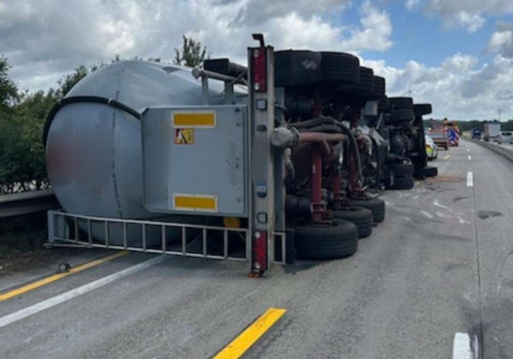Ein mit Zucker beladener Lkw ist auf der A7 in Fahrtrichtung Hamburg in einer Baustelle umgekippt.