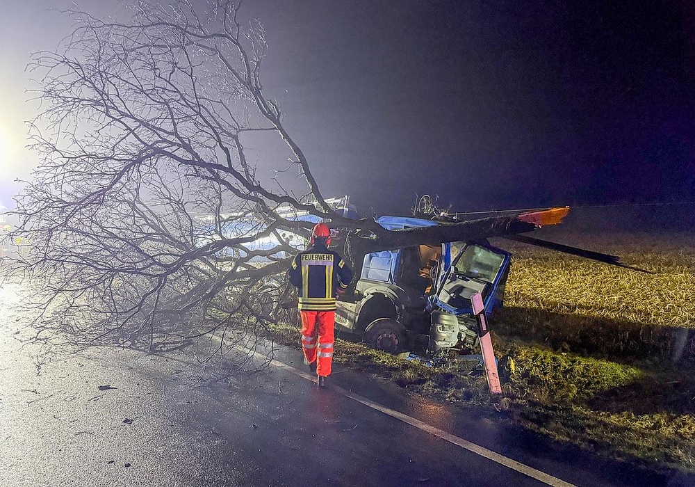 Der LKW kam im Seitengraben zum Stehen, nachdem er mit einem Baum kollidiert war.
