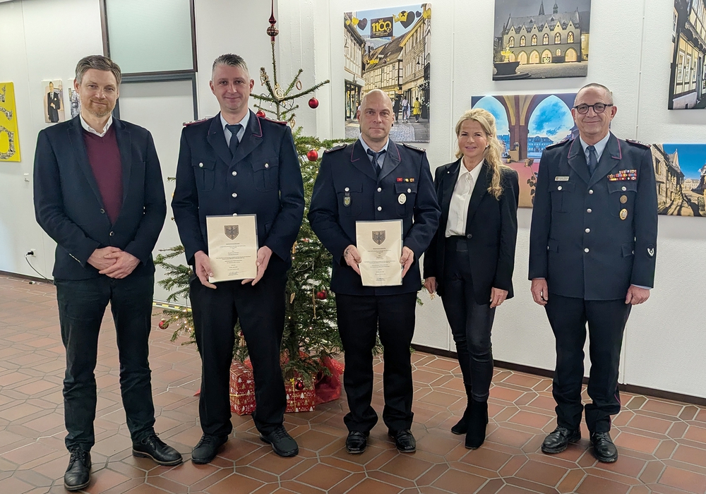 Beide waren seit dem 1. November 2023 kommissarisch in dieser Funktion tätig und haben zwischenzeitlich die erforderlichen Lehrgänge erfolgreich absolviert. Damit erfüllten sie alle formalen Voraussetzungen, um ihren kommissarischen Status abzulegen. Die Ernennungen gelten mit Wirkung zum 1. Januar 2026. Die Urkundenübergabe fand im Büro der Oberbürgermeisterin in der Stadtverwaltung Goslar statt. Stadtbrandmeister Christian Hellmeier begleitete die Ernennung und würdigte das Engagement beider Feuerwehrmänner. „Sowohl Sebastian Kleina als auch Sebastian Kaczmarek leisten wertvolle Arbeit in ihren Ortsfeuerwehren und haben sich das Vertrauen und die offizielle Bestätigung ihres Amtes verdient. Beide können ihre beruflichen Tätigkeiten mit ihren Aufgaben in der Feuerwehr gut vereinbaren“, betonte Hellmeier. Während Sebastian Kleina im Rettungsdienst arbeitet, ist Sebastian Kaczmarek selbständig tätig.