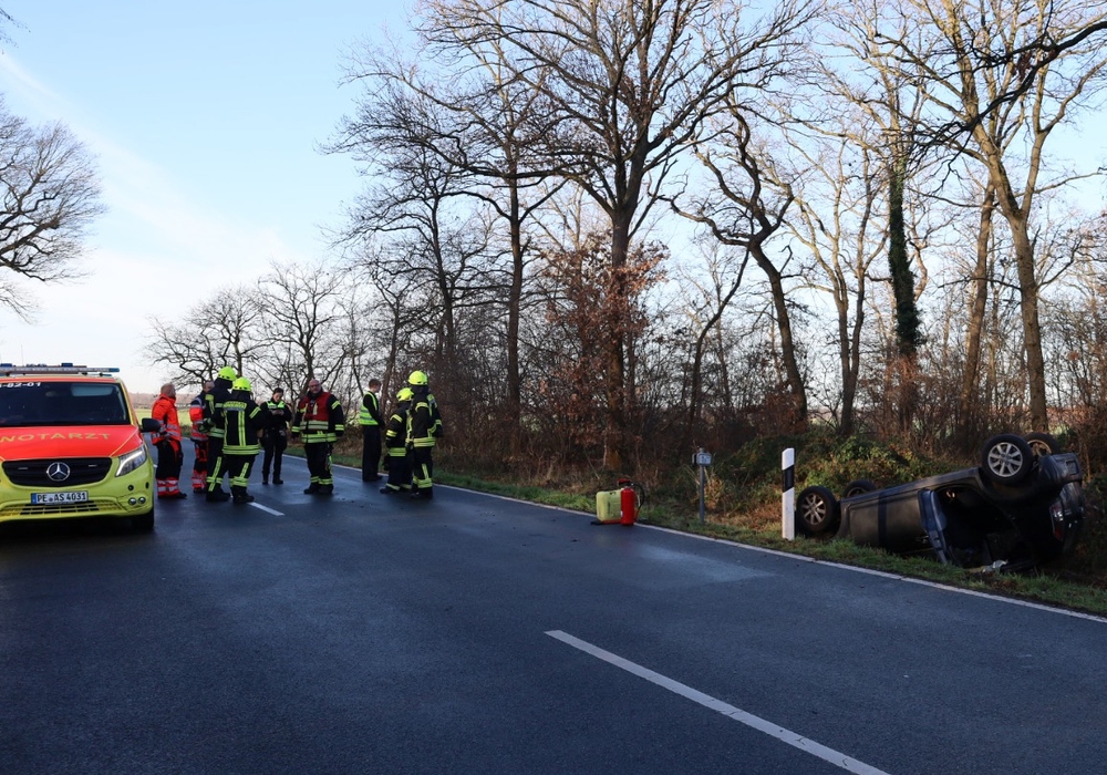 Gegen kurz nach 10 Uhr wurden Rettungskräfte zu einem gemeldeten Verkehrsunfall mit eingeklemmter Person auf die Kreisstraße 47 zwischen Dungelbeck und Woltorf alarmiert. Vor Ort stellt sich nach Angaben der Polizei vor Ort die Lage so dar, dass eine alleinbeteiligte Autofahrerin, aufgrund von möglicher Glätte von der Fahrbahn abkam, sich mehrfach überschlug, und auf dem Dach zum Liegen kam.