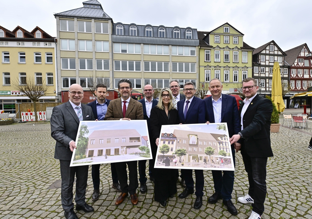 Stellten die Pläne vor: (von links) Stefan Honrath, Leiter der Direktion Peine, Volksbank BRAWO Julian Hartwig, Projektleitung, struhk architektur GmbH Carsten Ueberschär, Vorstandsmitglied, Volksbank BRAWO Bernd Paliga-Könecke, Geschäftsführender Gesellschafter, struhk architektur GmbH Prof. Gesche Grabenhorst, Architektin und Vorsitzende der Wettbewerbsjury Ulf Müller, Geschäftsführer BRAWO RE Building Solutions GmbH Markus Wenk, Leiter Unternehmensservice, Volksbank BRAWO Bürgermeister Klaus Saemann, Stadt Peine Stadtbaurat Florian Hahn, Stadt Peine Foto: Volksbank BRAWO/Isabell Massel