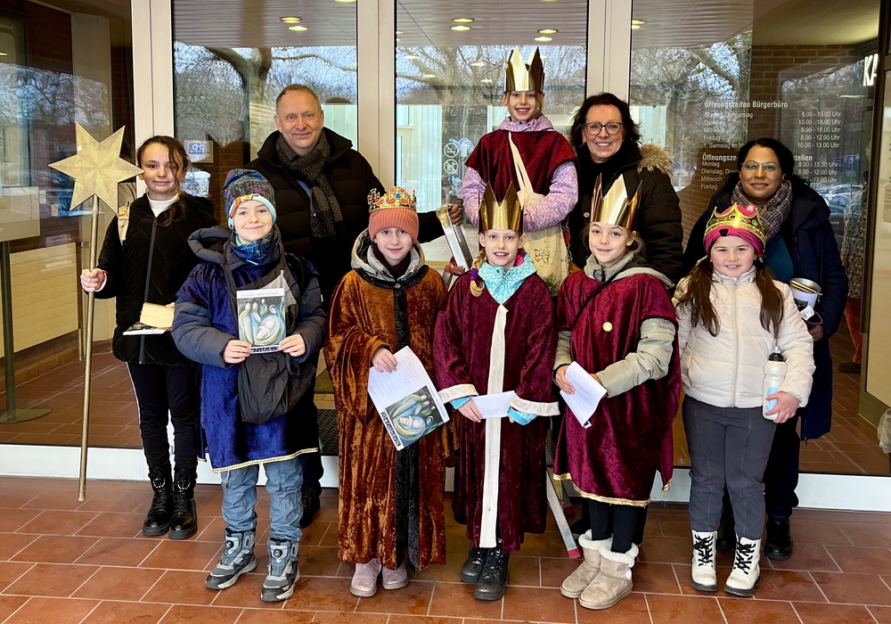 „Schule statt Fabrik – Sternsingen gegen Kinderarbeit“ – so lautet das Motto der Aktion Dreikönigssingen 2026, zu dem beide Rathaustüren am heutigen Freitag den diesjährigen Segen erhielten. Bürgermeister Klaus Saemann freute sich, dazu die aus sieben Kindern bestehende Sternsinger-Gruppe zu begrüßen, und bedankte sich mit einer kleinen Spende und einer süßen Überraschung. Begleitet wurden die Kinder von Frau Petra Zappe, Gemeindereferentin der Katholischen Pfarrgemeinde "Zu den Heiligen Engeln", Peine, und Frau Subramaniam als unterstützendes Gemeindemitglied.