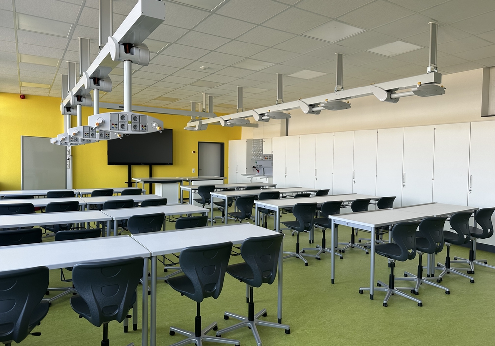 Besonders hervorzuheben sei die durchdachte Gestaltung des Raumes. Das Deckensystem mit den Versorgungsanschlüssen eröffne eine hohe Flexibilität bei der Anordnung der Arbeitsplätze und ermöglicht vielfältige Unterrichtssettings – vom klassischen Experiment bis hin zu offenen, kooperativen Lernformen. Dadurch wird der Raum selbst zu einem aktiven Bestandteil des Unterrichts.