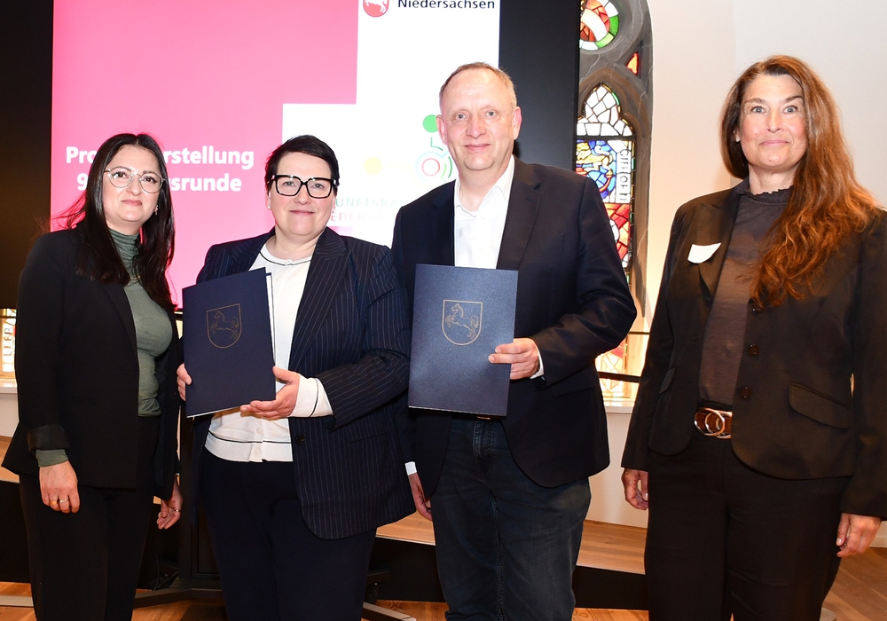 Niedersachsens Ministerin für Europa und Regionale Landesentwicklung, Melanie Walter, überreichte zwei Förderbescheide auf der historischen Rathausdiele in Goslar an Peines Bürgermeister Klaus Saemann, Aufsichtsratsvorsitzender der Peine Marketing GmbH, Saha Onal-Elmas, Stabsstellenleiterin Wirtschaftsförderung der Stadt Peine und Anja Barlen-Herbig, Geschäftsführerin Peine Marketing.