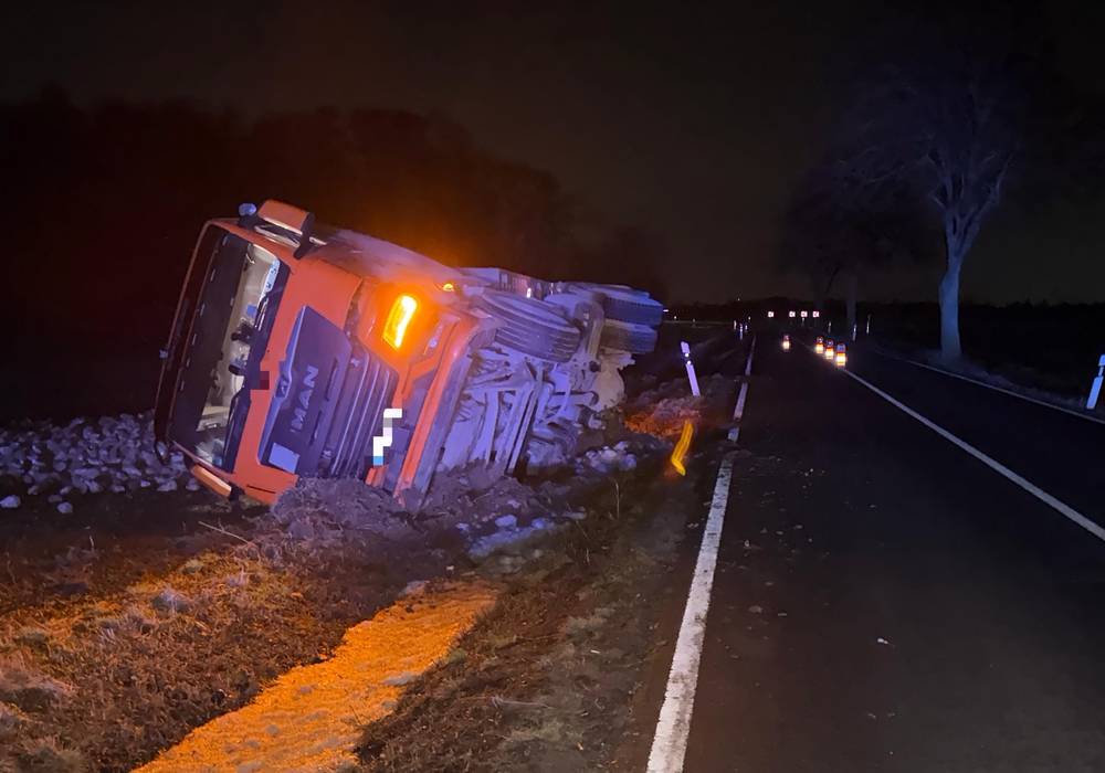 Entgegen der ersten Meldung um 5:46 Uhr - „Verkehrsunfall mit eingeklemmter Person in LKW“ - wurde laut Polizei bei dem Unfall niemand eingeklemmt und auch nicht verletzt. Aus bisher ungeklärter Ursache kam der Fahrer eines mit Rüben beladenen LKW von der Fahrbahn ab und rutschte dabei in einen Graben.